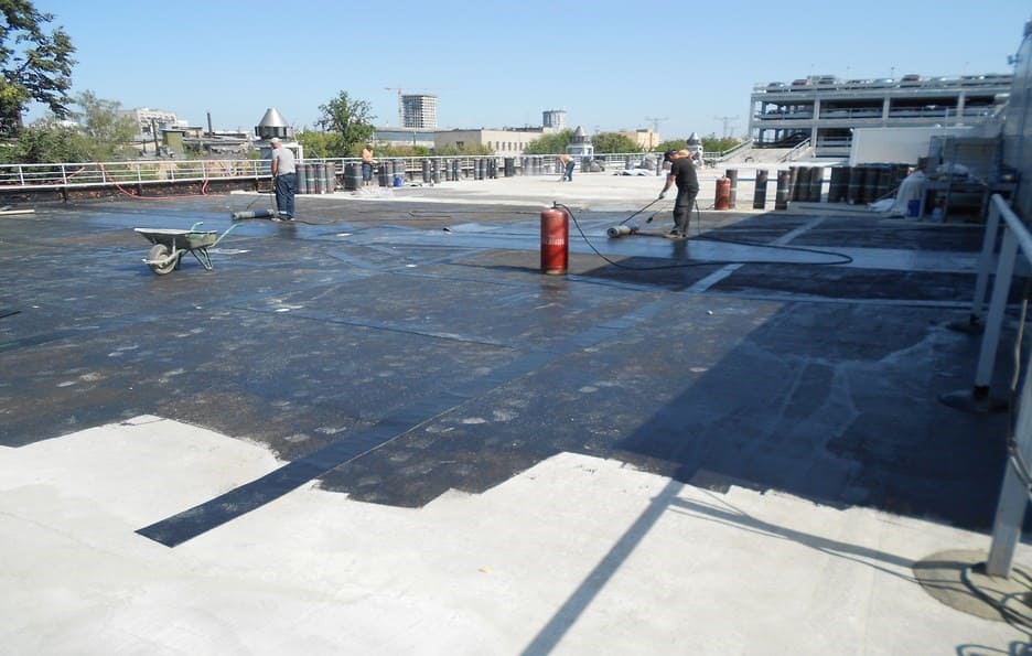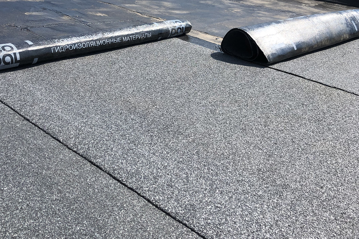 - Гидроизоляция — укладка рулонного материала или нанесение жидкой резины. Швы проклеиваются, края фиксируются в водосточных желобах.